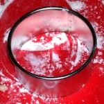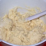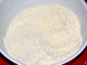 Add the butter to the dry ingredients. Try to separate the pieces a bit as you add, it makes this step easier. Then, using two knives, a pastry blender, or (like I did today) the tips of your fingers, incorporate the butter into the dry ingredients. Just rub the butter into the flour, until the entire mess resembles bread crumbs. If your hands are really hot, like mine, you’ll probably need to wash your hands now (or at least wipe them on your apron).