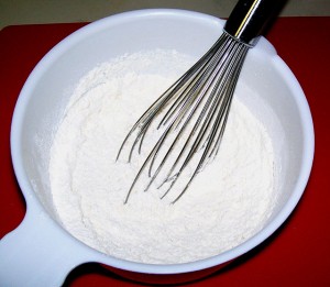 Start by whisking the dry ingredients together in a big bowl. You could use a food processor for this part (and I have in the past), but I’ve found that the motor can melt the butter too much, so I stick to the whisk & bowl method. You could also sift the ingredients together, but I didn’t really want to get my sieve dirty this morning. If you do sift, the biscuits end up a little lighter.