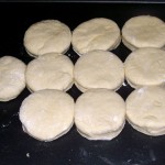 Grab a sheet pan, and apply the biscuits. Make sure they’re touching slightly, and don’t grease the pan; this contributes to the lift (they can’t stretch out on the sides, so they have to go up). Use your thumb and make little dimples in the top. Not very deep, just enough that the center is lower than the outside edges. Brush a little milk on the tops of the biscuits for some extra browning, then put the pan in the middle of your oven for 10-12 minutes.