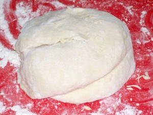Put a bit of flour on your board, then turn the dough out, and knead 5-10 times, just to pick up any extra dough that didn’t get worked in while you were using the spoon. Again, don’t work the dough too much here: you’re just trying to get everything together, not make pizza.